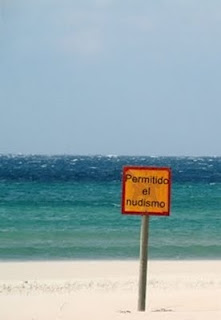 (imagen publicada en el artículo citado: el nudismo no se puede prohibir, pero tampoco permitir, no se puede permitir o no ser como uno/a es y que los demás puedan verlo. Por tanto ese cartel es tan ilegal y absurdo como poner «permitido respirar»)